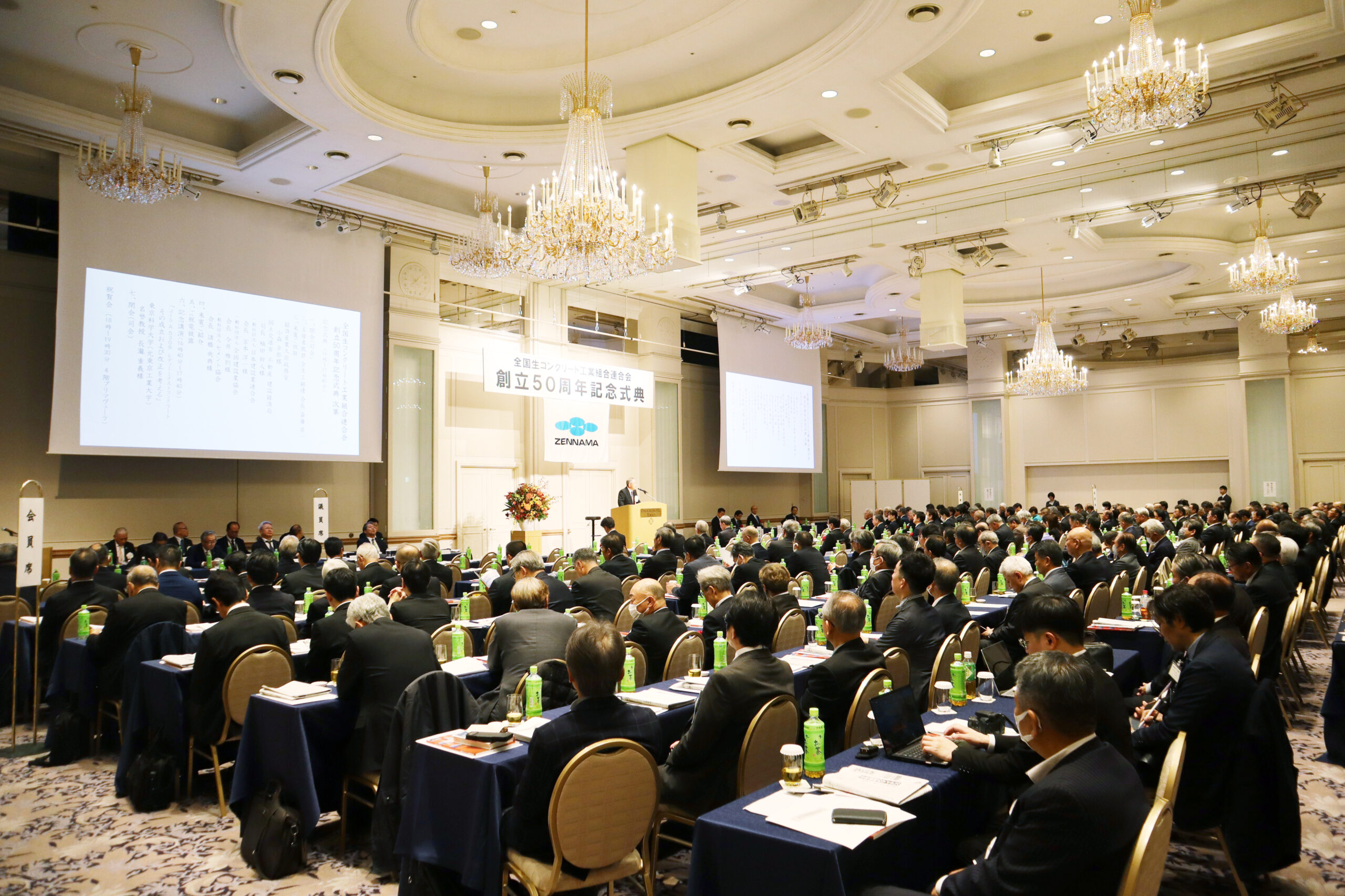 全国生コンクリート工業組合連合会(斎藤昇一会長)は10日、都内の第一ホテル東京で全国理事長会議・創立50周年記念式典を開いた。式典の冒頭であいさつにたった斎藤会長は、これまでの半世紀について、「荒波の連続だったが、国民の生命や財産、地域の経済・雇用を守るためになくてはならない産業であるという自負の下、困難な状況にあっても諸課題に挑戦してきた」と振り返った。そのうえで、今後について「業界のさらなる安定が重要」と指摘。生コン業界が打てる一手として、工場の集約化や組合の合併といった構造改善に取り組む必要性を強調した。