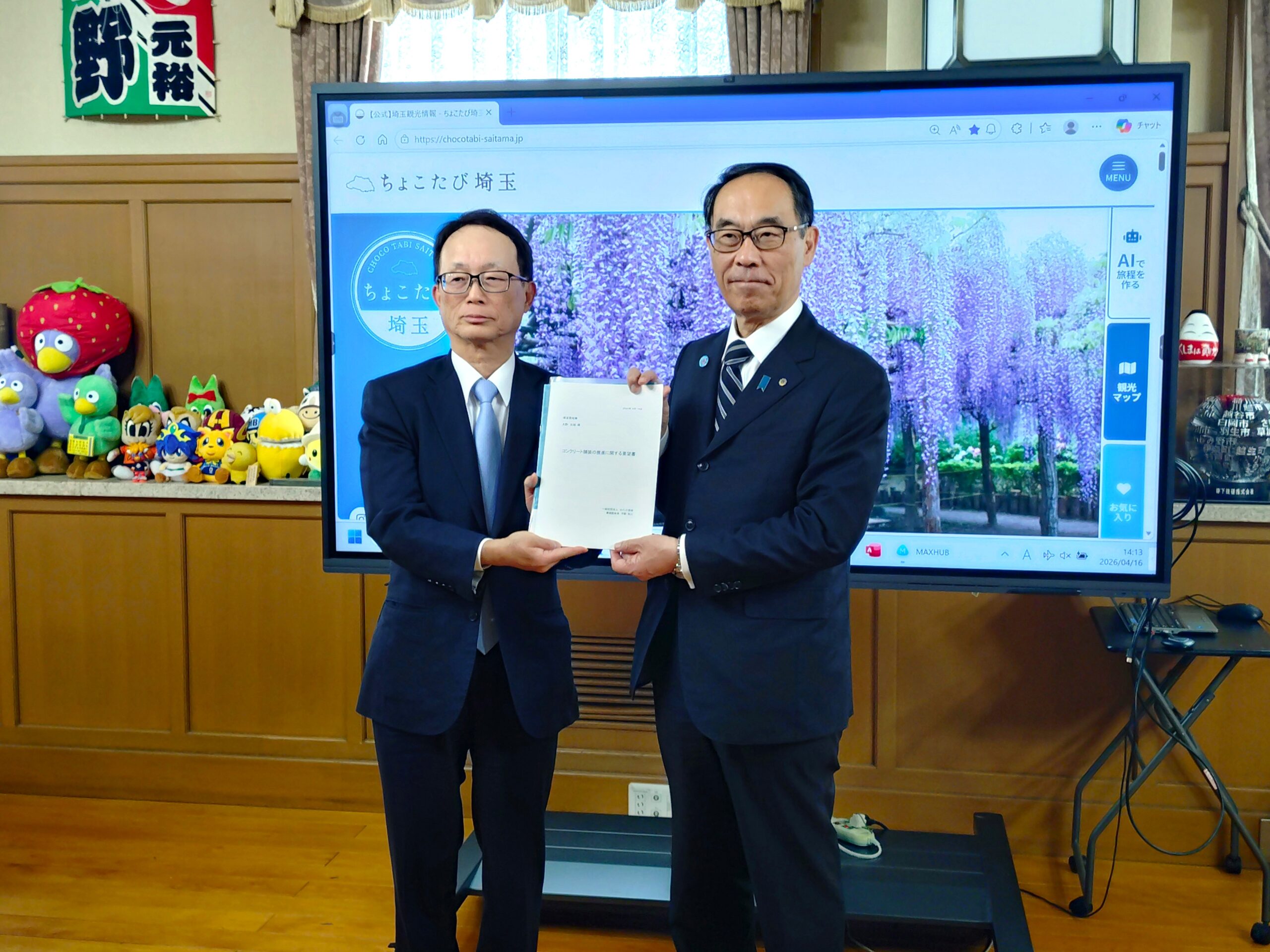 セメント協会の平野和人副会長(UBE三菱セメント社長)が16日に埼玉県庁を訪れ、コンクリート舗装の利用拡大を求める要望書を大野元裕知事に直接手渡した。大野知事は、耐久性が要求されるバスターミナルや交差点、地下埋設物のない道路などコンクリート舗装の強みを発揮できる用途で利用していきたいとの意向を示した。